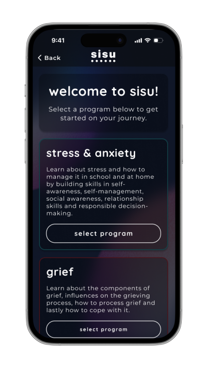 Teenagers are tired of learning through long classes, heavy textbooks, and awkward talks with adults. With Sisu, they receive self-guided content every week, delivered to their device, in their native digital language (aka short videos of teens in conversation with licensed professionals). It’s emotional and social wellbeing designed by therapists, made for teens.